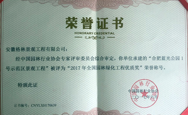 2017年6月18日,由中國園林行業(yè)協(xié)會(huì)主辦的2017中國園林綠化發(fā)展高層論壇在大連隆重開幕。會(huì)上,我司承接的“藍(lán)光公園1號(hào)示范區(qū)景觀工程”被授予“2017年全國園林綠化工程優(yōu)質(zhì)獎(jiǎng)”。