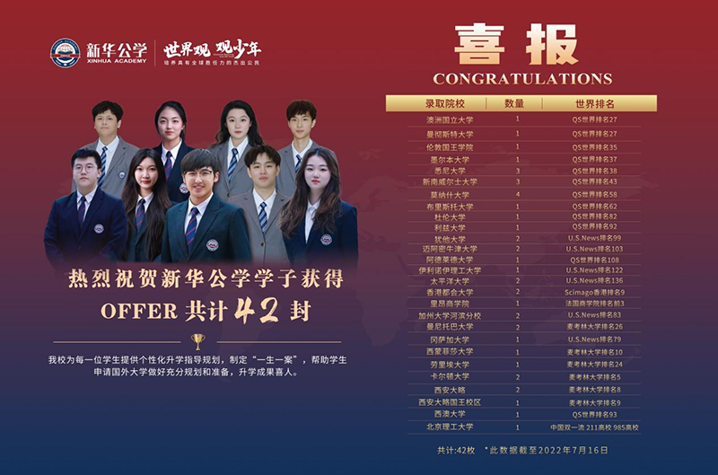 新華學(xué)子捷報(bào)頻傳、教學(xué)成果碩果累累。新華公學(xué)首屆12年級(jí)畢業(yè)生共收獲42封世界名校offer,其中包含世界Top50海外名校以及國(guó)內(nèi)“雙一流”名校。用新華學(xué)子的實(shí)際成績(jī),向支持認(rèn)可新華公學(xué)的家長(zhǎng)和社會(huì)各界交出了一張滿意的答卷。