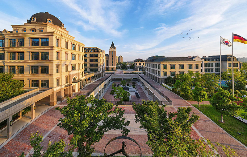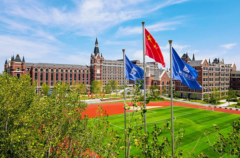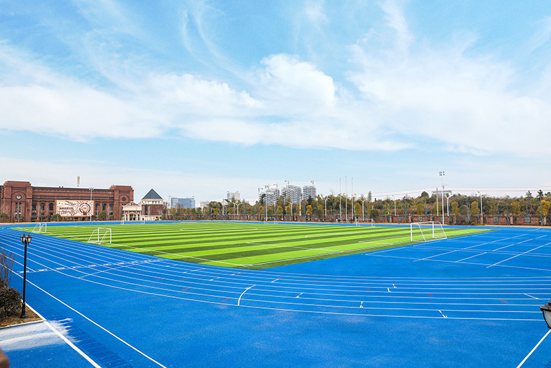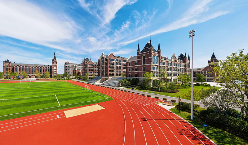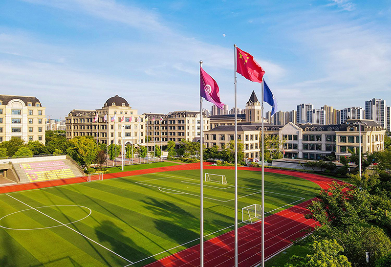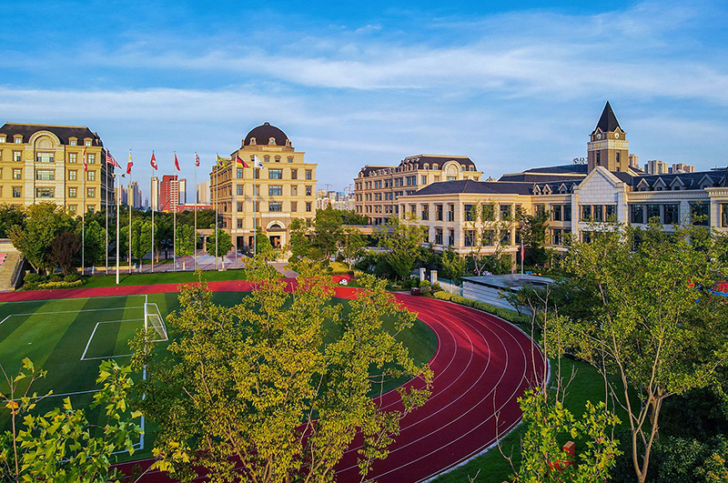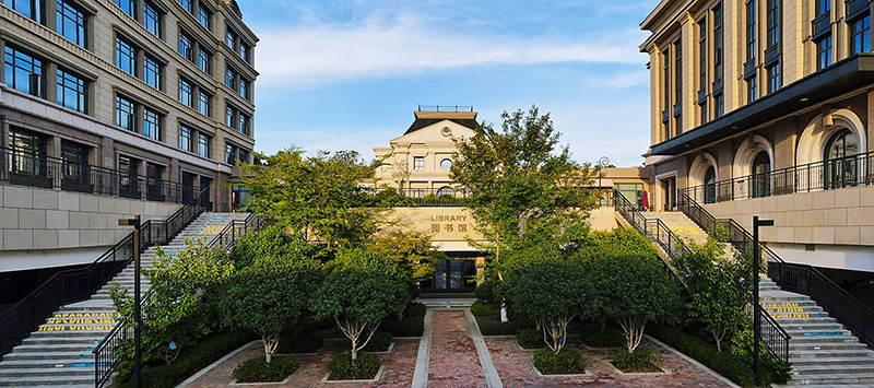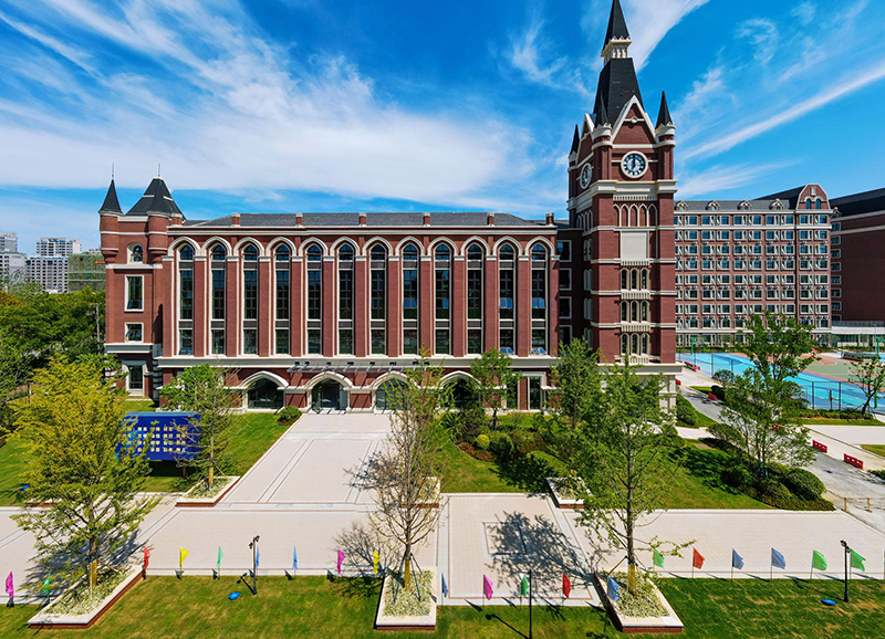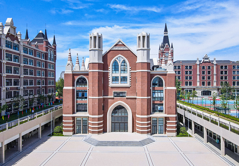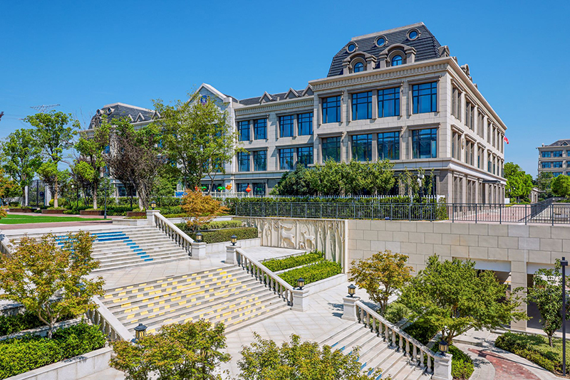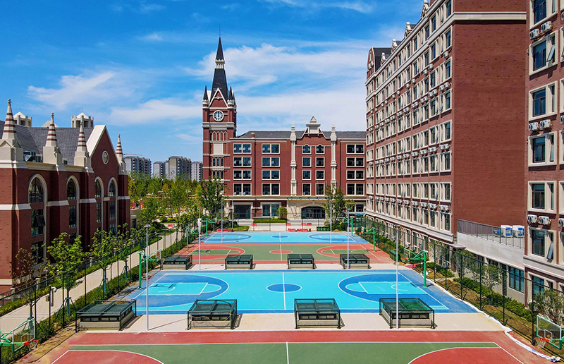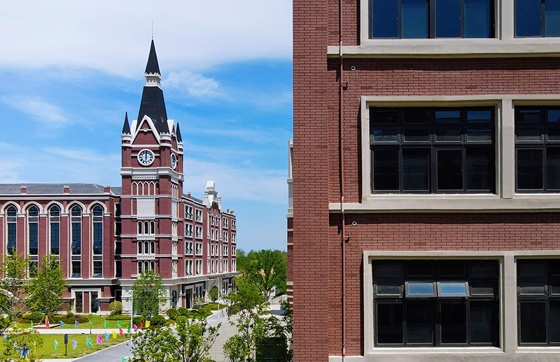 國際藍(lán)及華夏紅的配色,突顯出校園國際品質(zhì)感,褐色的墻面搭配綠茵草地,書香氣息渾然天成。
