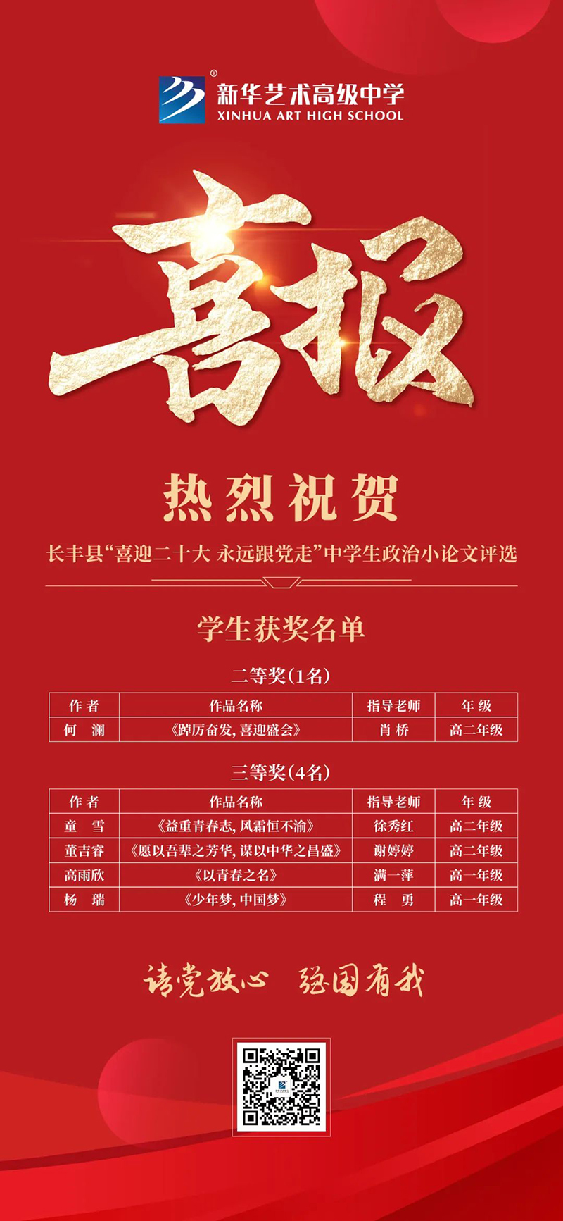 為慶祝黨的二十大即將隆重召開(kāi),進(jìn)一步增強(qiáng)新時(shí)代青少年的光榮感、責(zé)任感、使命感,引領(lǐng)廣大青少年踐行“請(qǐng)黨放心,強(qiáng)國(guó)有我”的青春誓言,贊美新時(shí)代,奮進(jìn)新征程。新華藝術(shù)高級(jí)中學(xué)積極響應(yīng)長(zhǎng)豐縣教體局號(hào)召,組織學(xué)生踴躍參與長(zhǎng)豐縣“喜迎二十大 永遠(yuǎn)跟黨走”中學(xué)生政治小論文評(píng)選活動(dòng),獲得可喜成績(jī),共有5人獲獎(jiǎng),其中二等獎(jiǎng)1名、三等獎(jiǎng)4名。