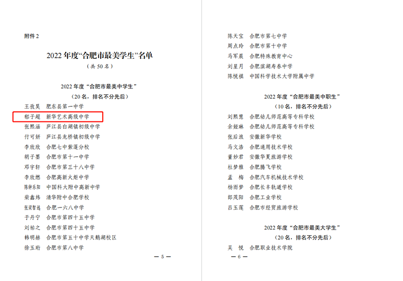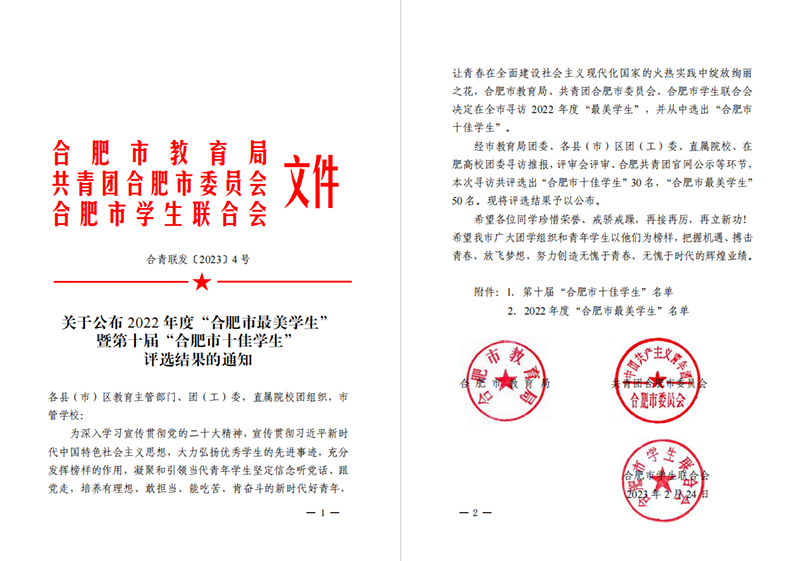 為深入學(xué)習(xí)宣傳貫徹黨的二十大精神,宣傳貫徹習(xí)近平新時(shí)代中國(guó)特色社會(huì)主義思想,大力弘揚(yáng)優(yōu)秀學(xué)生的先進(jìn)事跡,充分發(fā)揮榜樣的作用,近日,由合肥市教育局、共青團(tuán)合肥市委員會(huì)、合肥市學(xué)生聯(lián)合會(huì)聯(lián)合開展的2022 年度“合肥市最美學(xué)生” 暨第十屆“合肥市十佳學(xué)生” 評(píng)選結(jié)果出爐。我校高二(1)班郁子超同學(xué)獲評(píng)“合肥市最美中學(xué)生”稱號(hào)!