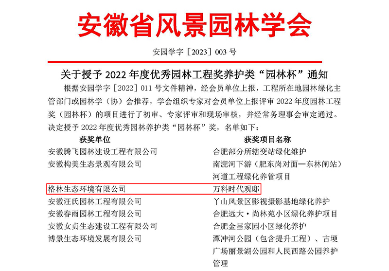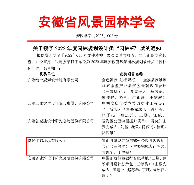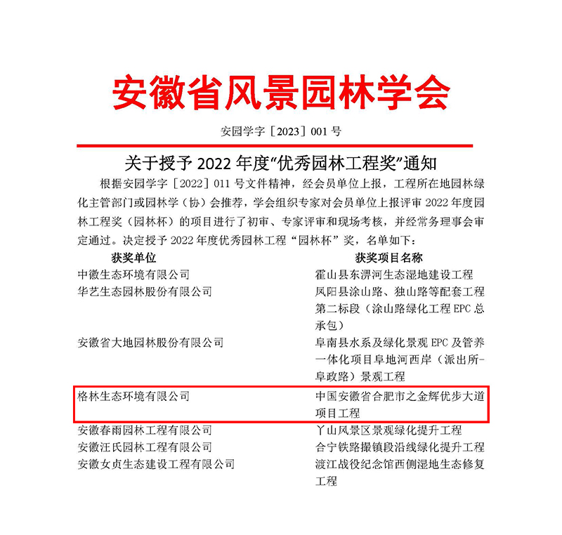 時光不負努力,付出皆有所獲。近日,2022年度安徽省風景園林學會“園林杯”獎評審結(jié)果正式出爐,格林生態(tài)環(huán)境有限公司喜報頻傳,共斬獲三項榮譽:2022年度優(yōu)秀養(yǎng)護類“園林杯”獎、安徽省風景園林規(guī)劃設計類“園林杯”獎、優(yōu)秀園林工程“園林杯”獎。