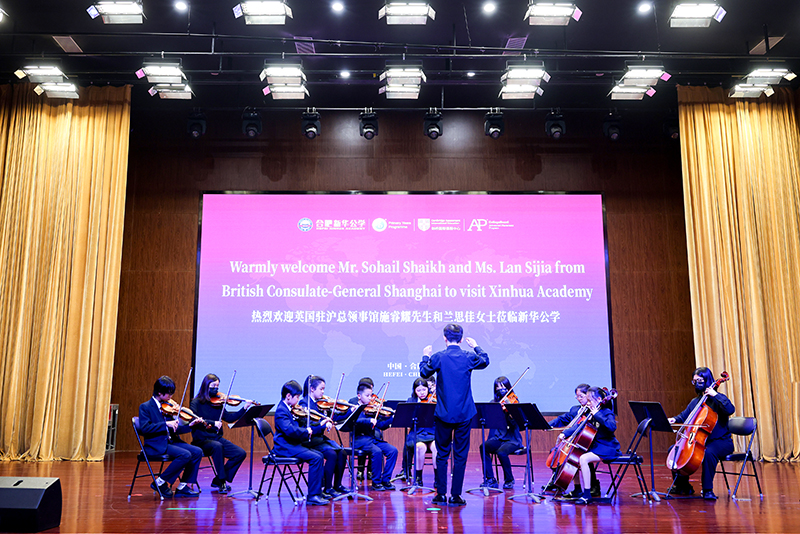 5月25日下午14:00時,英國商業(yè)貿(mào)易部公使銜參贊施睿耀先生、英國商業(yè)貿(mào)易部教育與技能司高級貿(mào)易投資官蘭思佳女士一行來訪,合肥市教育局辦公室張媛主任陪同,新華公學(xué)總校長秦新春、融合部校長溫晨瑋、行政副校長吳晶晶等校領(lǐng)導(dǎo)熱情接待。首先在報告廳舉行了簡單的歡迎儀式,新華國際青少年樂團用精彩的表演對來訪嘉賓表示了熱烈的歡迎。