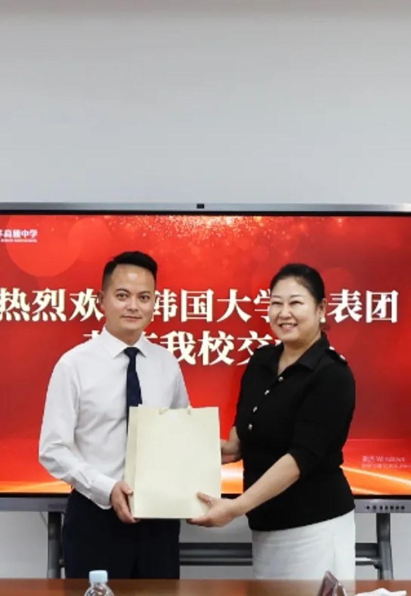 遠道而來的韓國交流團首先參觀了新華高級中學校園。參觀途中,吳東校長向韓國交流團介紹了學校的歷史、辦學理念以及校園文化等。學校現(xiàn)代化的校園設(shè)施、優(yōu)良的教學環(huán)境、先進的教育理念,讓交流團贊不絕口。在現(xiàn)場交流會上,代表團與我?;ハ噘浰土硕Y物。
