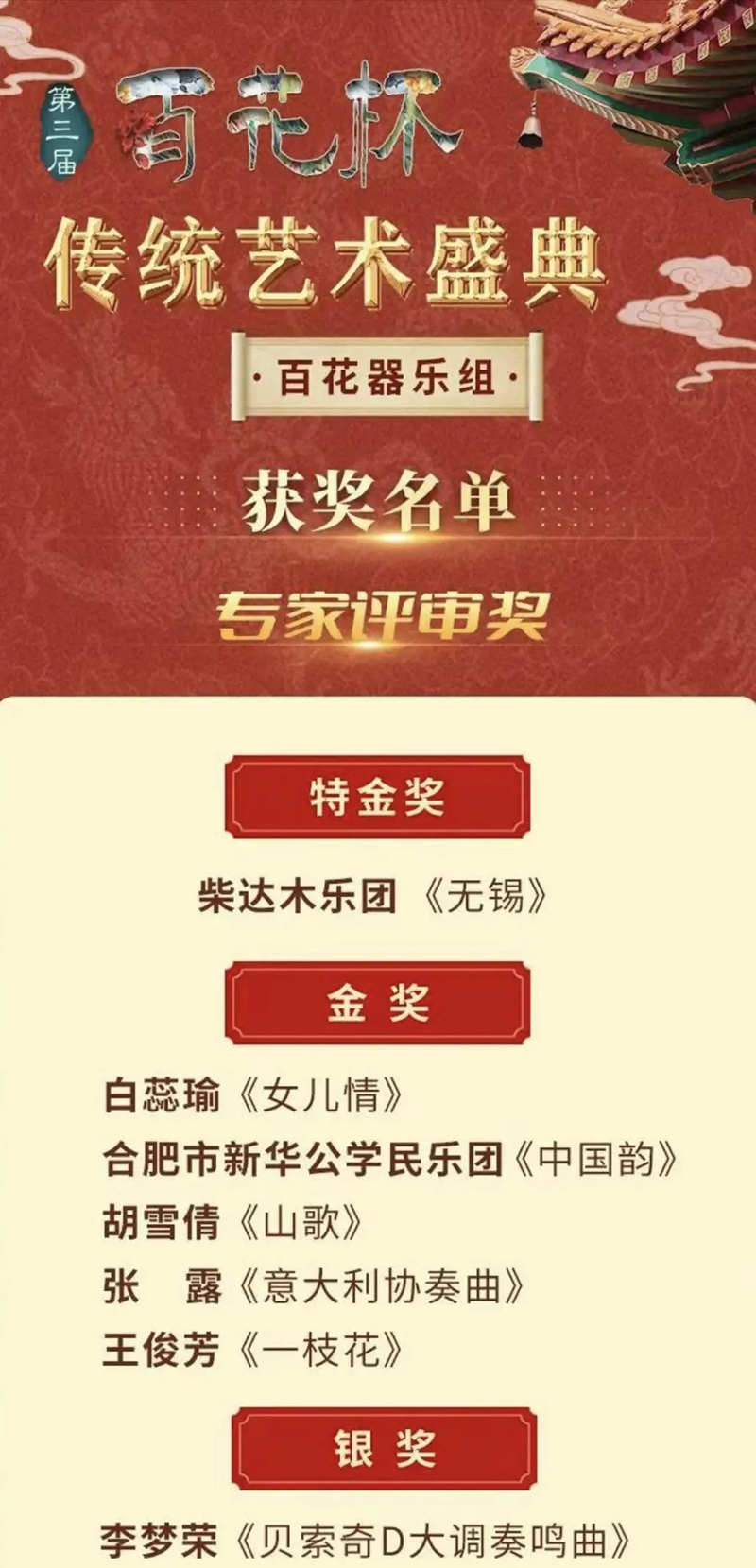 在百花獎(jiǎng)?lì)C獎(jiǎng)典禮的舞臺(tái)上,新華公學(xué)民樂(lè)團(tuán)的同學(xué)們精神飽滿,演奏了經(jīng)典曲目《中國(guó)韻》。他們的演奏如行云流水,音符間傳遞出深厚的民族情感,展現(xiàn)了極高的藝術(shù)水準(zhǔn)?,F(xiàn)場(chǎng)觀眾沉浸在美妙的音樂(lè)中,掌聲雷動(dòng)。最終,憑借精彩絕倫的表演,新華公學(xué)民樂(lè)團(tuán)脫穎而出,榮獲金獎(jiǎng)。