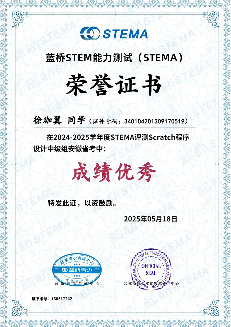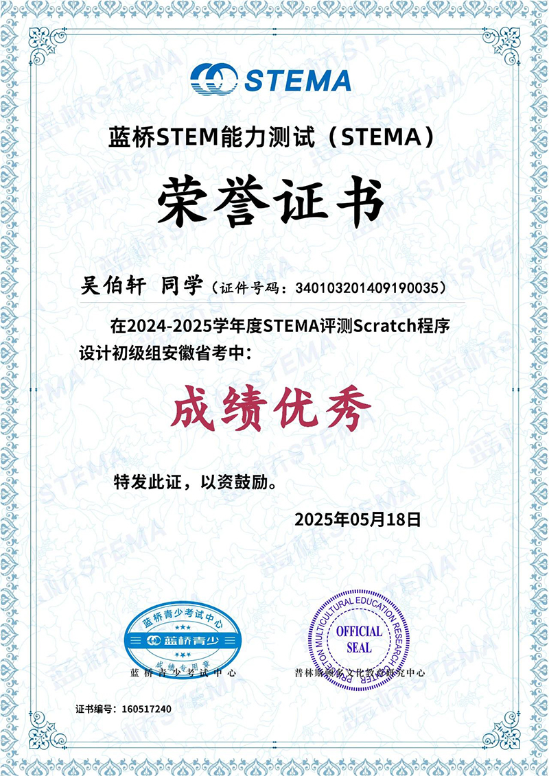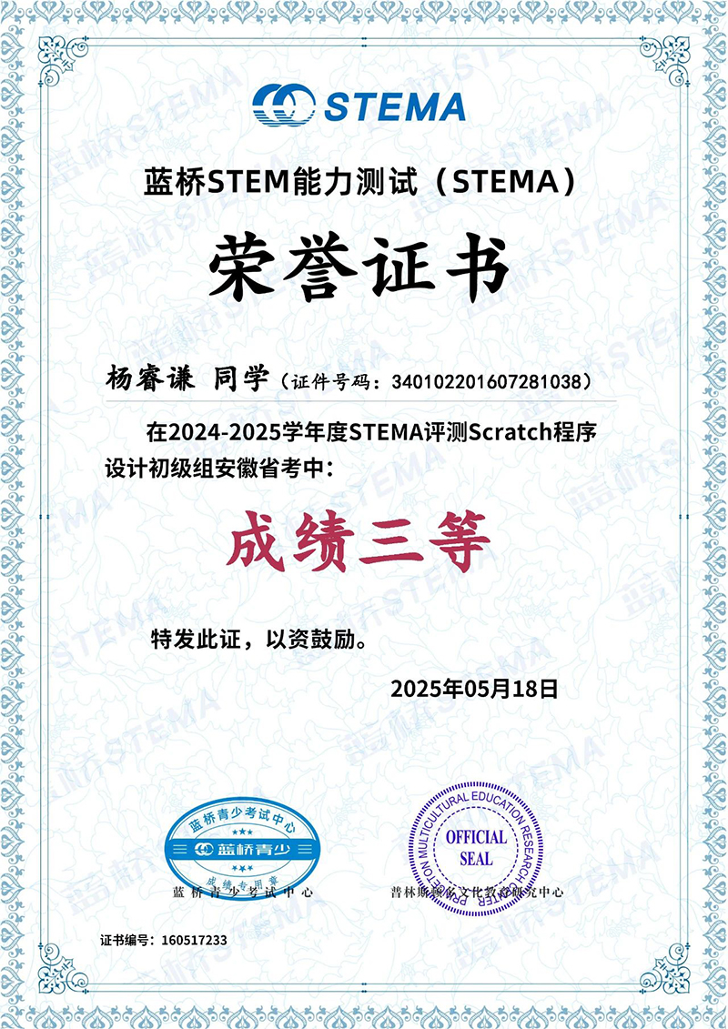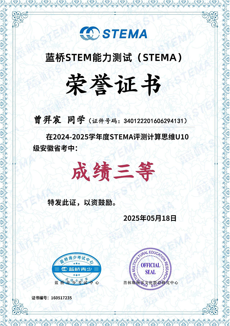 近日,藍橋STEMA安徽省考成績揭曉,我校多名學(xué)子在此次測評中脫穎而出、斬獲佳績,為學(xué)校爭得了榮譽。向所有獲獎同學(xué)致以最熱烈的祝賀!?