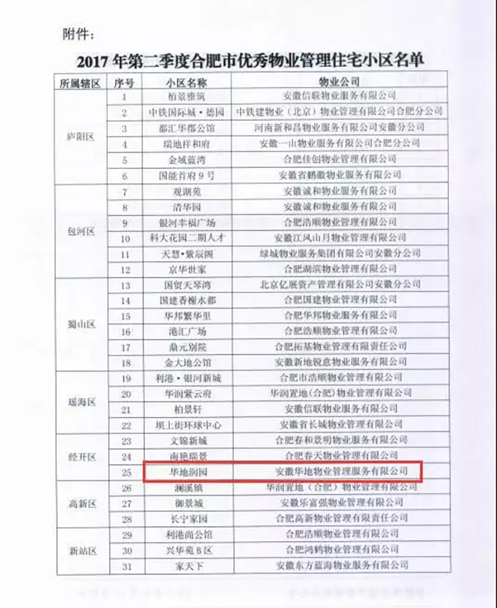 近日,合肥市房地產(chǎn)局發(fā)布通報(bào)、公布了“2017年第二季度合肥市優(yōu)秀物業(yè)管理住宅小區(qū)”名單,華地物業(yè)服務(wù)的華地潤園名列其中,成為全市31個(gè)獲此殊榮的住宅小區(qū)之一。