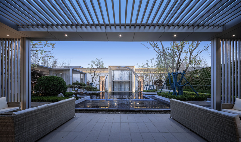 灰色廊架、斜飄古松倒映在鏡面水景。雄偉的銀杏、優(yōu)雅的烏柏桕,嚴(yán)肅而不失溫馨。正所謂月掛梢頭,天上人間。