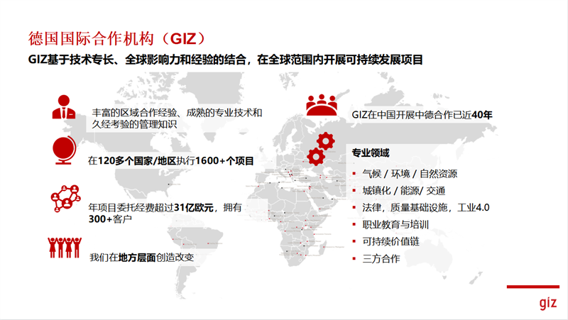 德國國際合作機(jī)構(gòu)(GIZ)是一個(gè)在全世界范圍內(nèi)致力可持續(xù)發(fā)展的國際合作非營利組織,擁有豐富的區(qū)域合作經(jīng)驗(yàn)、成熟的專業(yè)技術(shù)和久經(jīng)考驗(yàn)的管理知識。在120多個(gè)國家/地區(qū)執(zhí)行1600+個(gè)項(xiàng)目,業(yè)務(wù)范圍共包括氣候/環(huán)境/自然資源、城鎮(zhèn)化/能源/交通、法律、質(zhì)量基礎(chǔ)設(shè)施、工業(yè)4.0、職業(yè)教育與培訓(xùn)等。