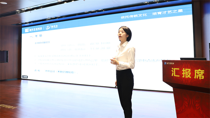 隨后,在激昂的樂曲和熱烈的掌聲中,主席臺領(lǐng)導(dǎo)走上舞臺共同開啟藝學(xué)堂教育教學(xué)質(zhì)量月啟動儀式。啟動儀式后,藝學(xué)堂教學(xué)管理中心助理總監(jiān)崔露璐做《教學(xué)管理制度培訓(xùn)》,對藝學(xué)堂教師管理制度做了詳細(xì)的解讀,并對日常教學(xué)規(guī)范提出了更高的要求。