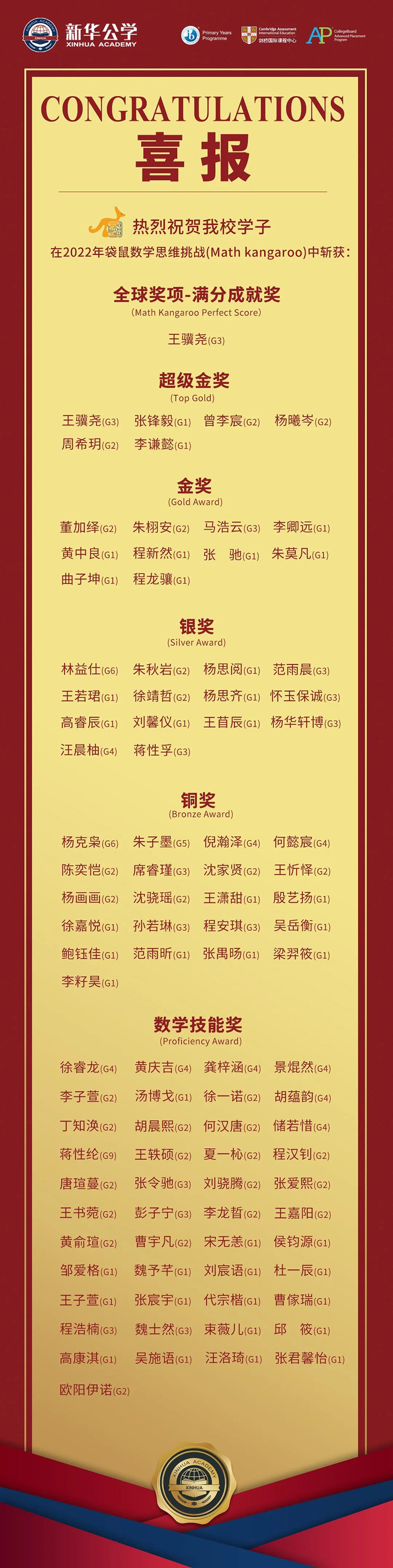 最后,再次祝賀所有獲獎同學(xué)與參賽同學(xué)!對數(shù)學(xué)的興趣只是起點,而在自己感興趣的領(lǐng)域深入鉆研、甚至選擇了高出自身年級的難度等級來挑戰(zhàn)自己,這樣的自信力與勇氣更為可貴!我們希望參賽的每一位新華學(xué)子,都能因這樣亮眼的成績而獲得成就感,在以后的學(xué)習(xí)中充滿動力、再創(chuàng)佳績!