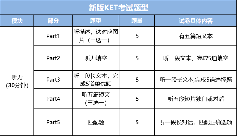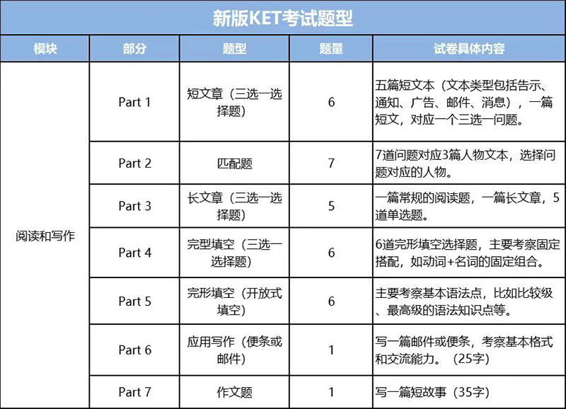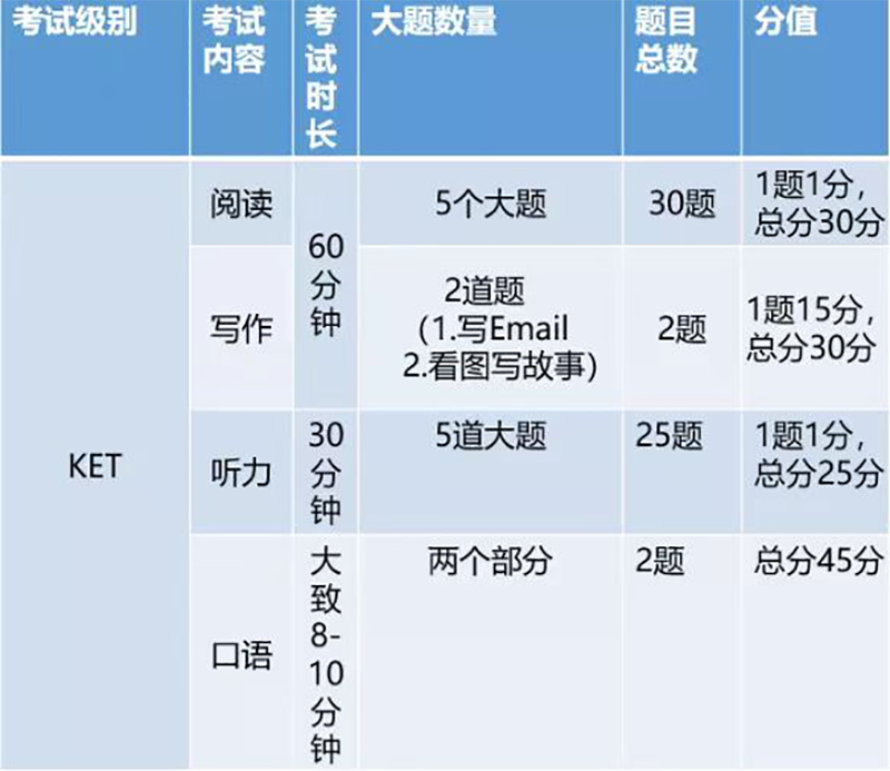 我們?cè)賮?lái)看看KET考試概況,KET主要考察四大方面,聽(tīng)、說(shuō)、讀、寫(xiě)四大部分,每一部分的題量和分值如下: