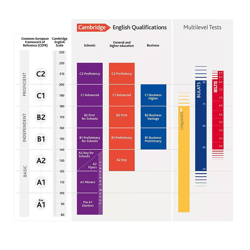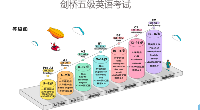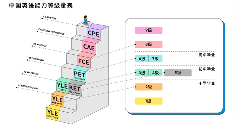下面一圖為大家介紹劍橋考試每個(gè)等級(jí)的水平對(duì)標(biāo)