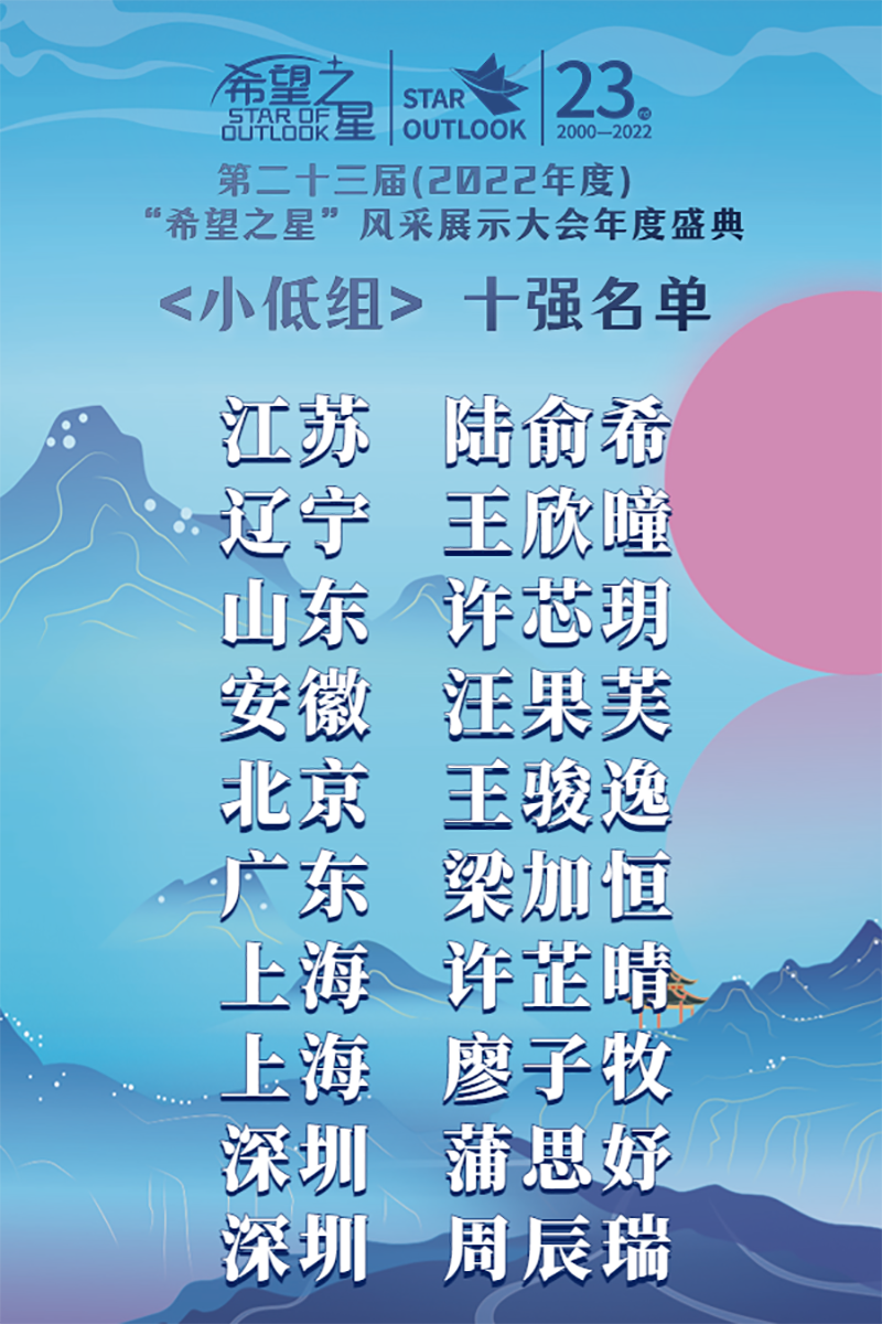 由中央新影中學(xué)生頻道和北京星路風(fēng)采國際教育咨詢有限公司聯(lián)合主辦的第二十三屆(2022年度)“希望之星”風(fēng)采展示大會于8月1日-4日,在北京舉辦了全國年度盛典活動。來自全國各地的“希望之星”們,經(jīng)過兩日的同臺競技,都收獲滿滿。五個(gè)組別的十強(qiáng)學(xué)員名單,正式出爐。