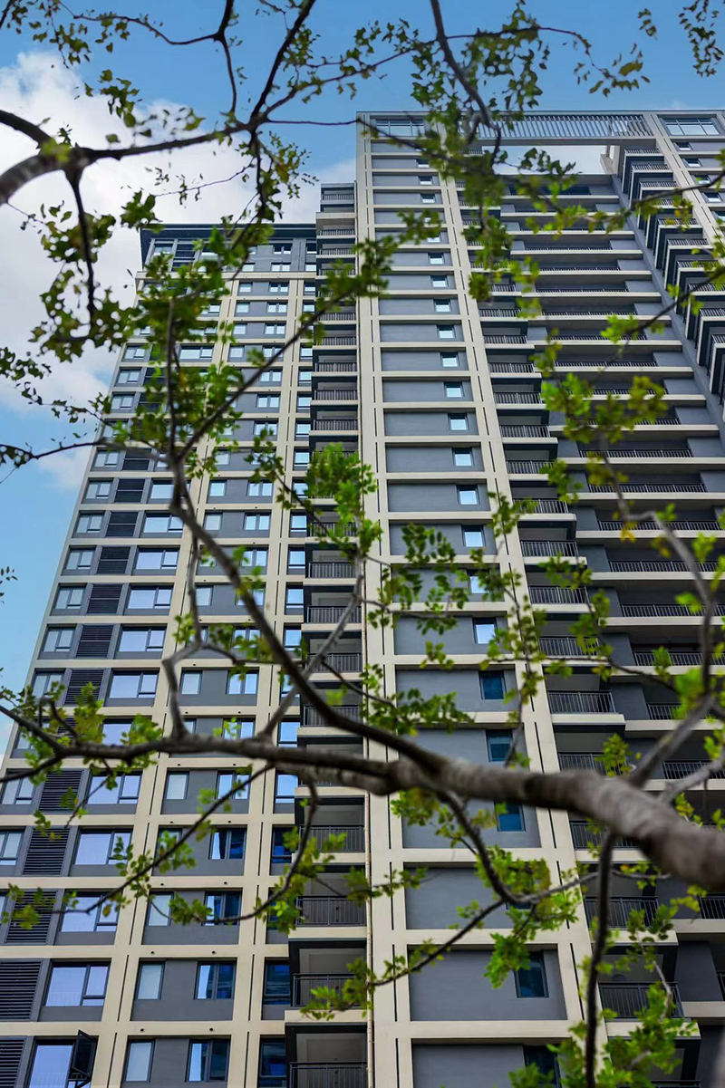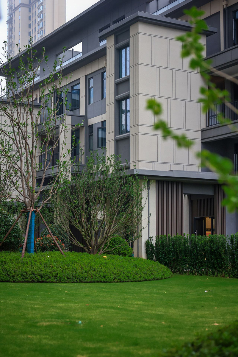 從方寸間的圖紙到漸露新姿的建筑,有序營造出歷久彌新的時代美學。簡約時尚的立面線條呈現(xiàn)建筑的挺拔感,于自然濃蔭中安靜掩映,盡顯清幽寧和。
