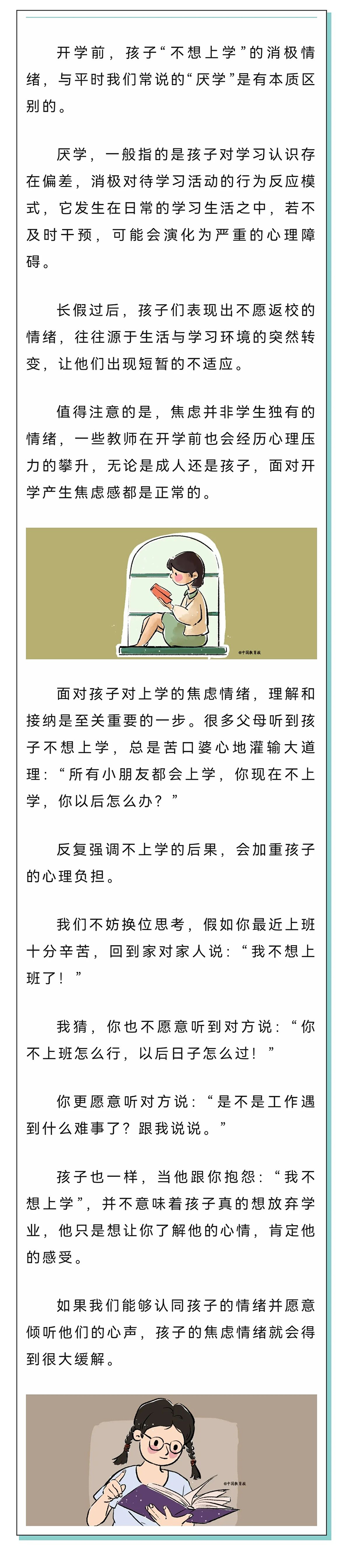 家長要嘗試去讀懂并理解孩子的情緒,幫助孩子分析原因,多鼓勵,多溝通。最重要的,是給予孩子積極的心理暗示。比如可以引導孩子回憶校園發(fā)生的趣事,喚醒孩子對老師同學、校園生活的想念,讓孩子重新燃起對學校生活的憧憬,從心理上對新學期充滿期待和信心。